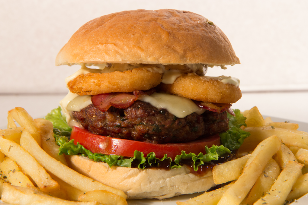 Χειροποίητο μπιφτέκι 180gr, brioce ψωμάκι, gouda , 2 φέτες τραγανό μπέικον , onion rings, bbq sause , μαρούλι, ντομάτα , filippou sause. Συνοδεύεται από πατάτες. Σερβίρεται ως έχει.