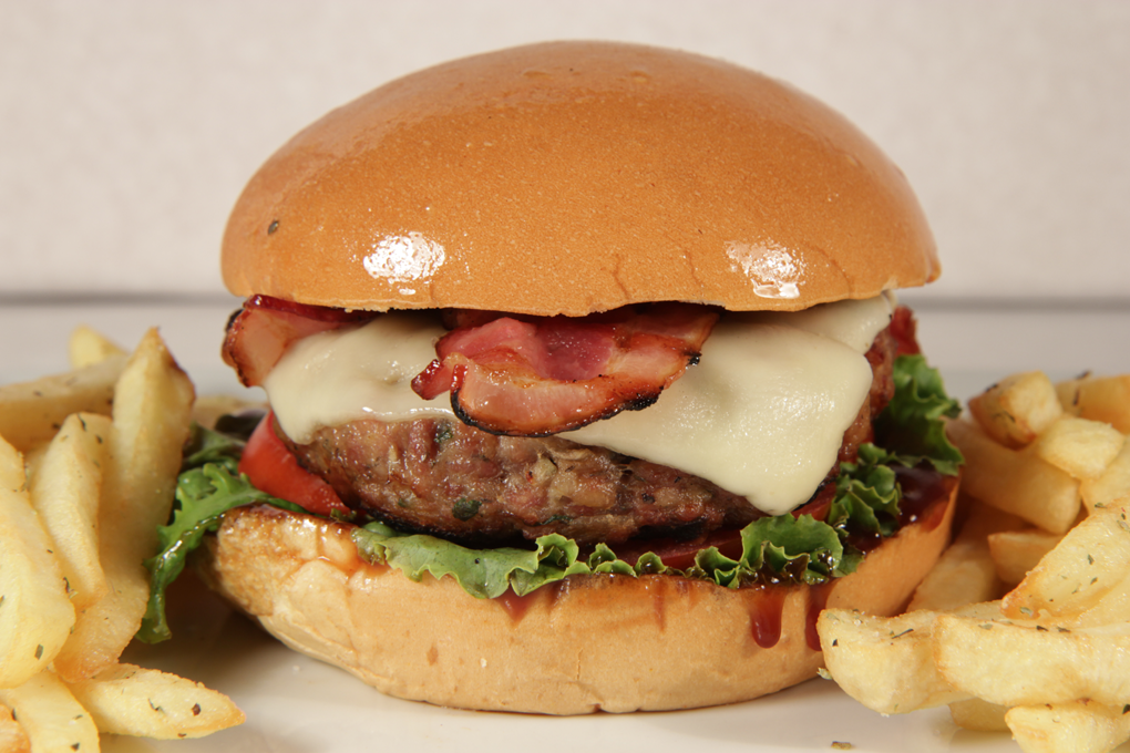 Χειροποίητο μπιφτέκι 180gr, brioce ψωμάκι, 2 φέτες τραγανό μπέικον , gouda , μαγιονέζα , μαρούλι, ντομάτα, bbq sause. Συνοδεύεται από πατάτες. Σερβίρεται ως έχει!