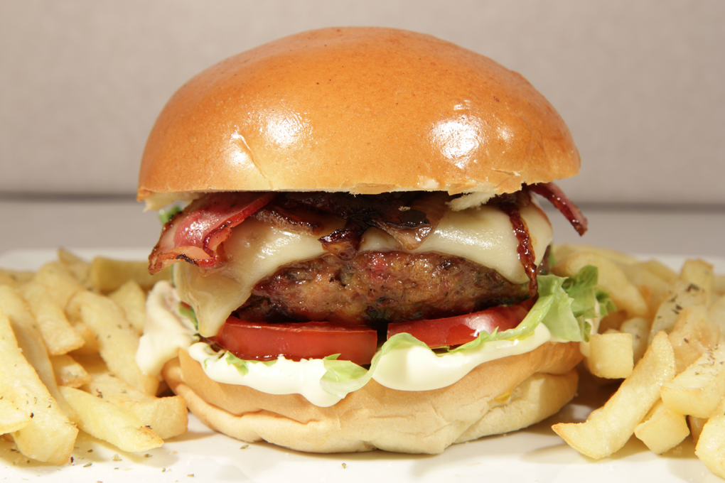 Χειροποίητο μπιφτέκι 180gr, brioce ψωμακι, 2 φετες τραγανό μπέικον ,gouda , iceberg ,ντομάτα , καραμελωμένα κρεμμύδια, Filippou Sause. Συνοδεύεται από πατάτες.Σερβίρεται ως έχει.