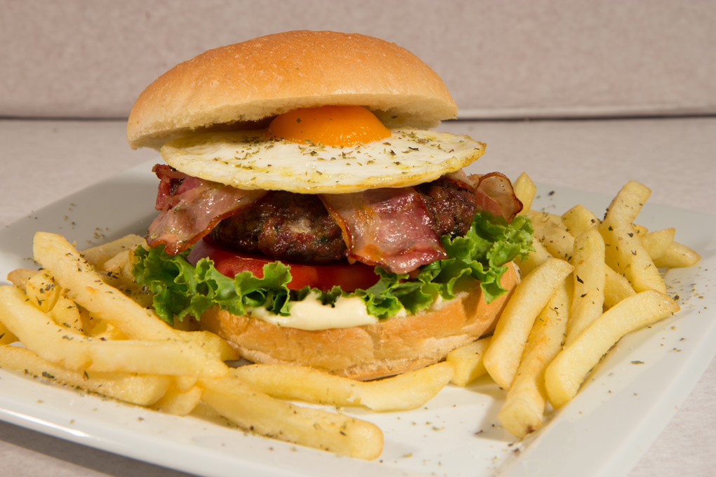 Χειροποίητο μπιφτέκι 180gr, brioce ψωμακι, τηγανητό αυγό, 2 φέτες τραγανό μπέικον, gouda , μαρούλι , ντομάτα, Filippou Sause. Συνοδεύεται από πατάτες. Σερβίρεται ως έχει.
