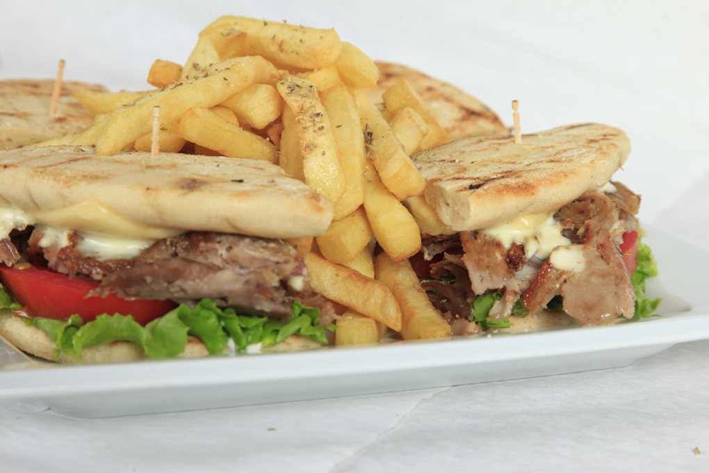 2 πίτες με γύρο κοτόπουλο, μαρούλι, ντομάτα, μαγιονέζα, sause filippou + πατάτες