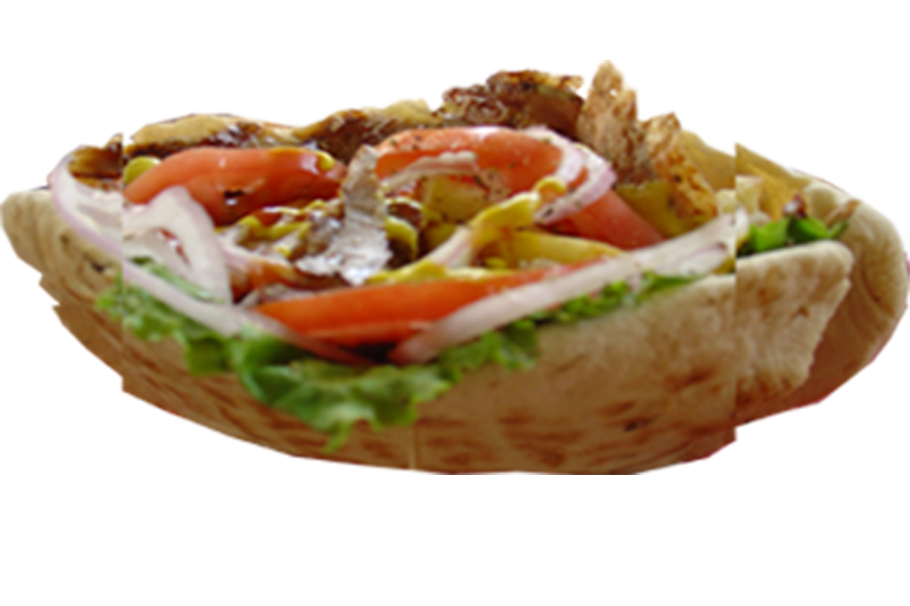 περιέχει γύρο χοιρινό και γυρο κοτόπουλο πατάτα, ντομάτα, μουστάρδα, κέτσαπ, κρεμμύδι