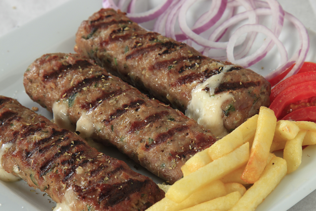 3 μπιφτέκια χειροποίητα γεμιστά με 3 τυριά, συνοδεύονται με πατάτες, ντομάτα, κρεμμύδι