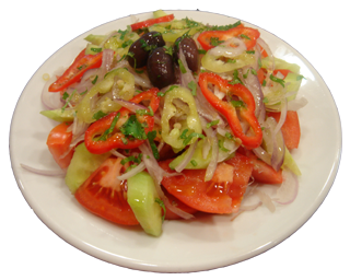 ντομάτα, αγγούρι, κρεμμύδι, ελιές, γλυκιά πιπεριά, ελαιόλαδο