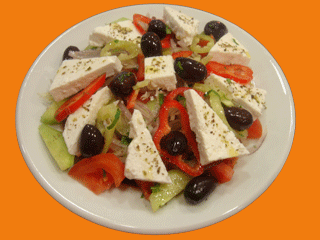 τυρί φέτα, ντομάτα, αγγούρι, κρεμμύδι, ελιές, γλυκιά πιπεριά, ελαιόλαδο