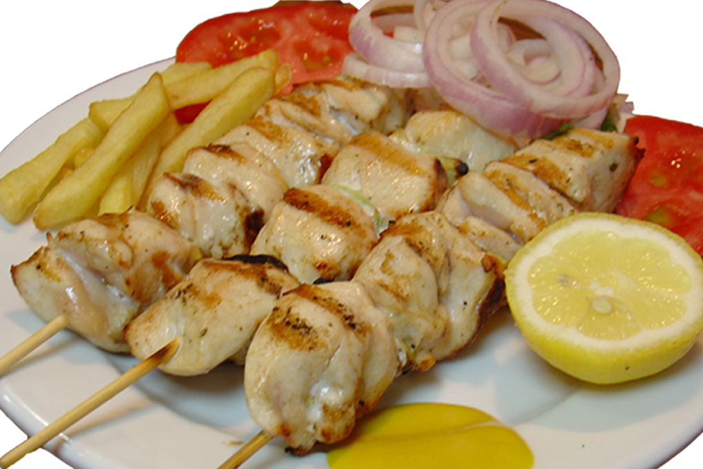 3 τεμ. σουβλάκι κοτόπουλο, συνοδεύονται με πατάτες, ντομάτα, κρεμμύδι