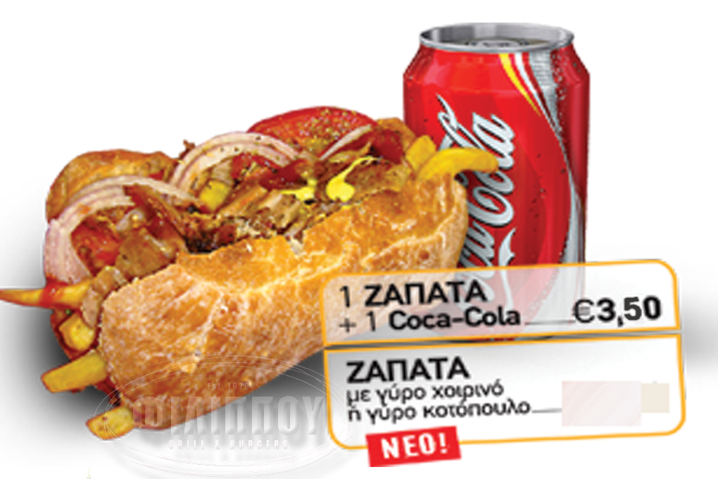 Ζαπάτα γύρος χοιρινός, πατάτα, ντομάτα, μουστάρδα, κέτσαπ, κρεμμύδι + Αναψυκτικό 330ml